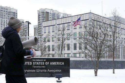 A woman walks past the U.S. Embassy in Kyiv, Ukraine, Monday, Jan. 24, 2022. The State Department is ordering the families of all American personnel at the U.S. Embassy in Kyiv to leave the country and allowing non-essential staff to leave Ukraine. The move comes amid heightened fears of a Russian invasion of Ukraine despite talks between U.S. and Russian officials. (AP Photo/Efrem Lukatsky) The Associated Press