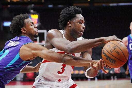 TORONTO (AP) - Pascal Siakam had 24 points and matched his career high with 12 assists, Gary Trent Jr. scored a season-best 32 and the Toronto Raptors never trailed in a 125-113 victory over the Charlotte Hornets on Tuesday night.