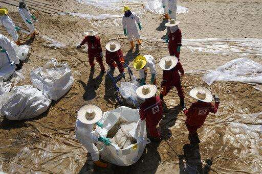 Workers carry out a cleanup operation on Mae Ramphueng Beach after a pipeline oil spill off the coast of Rayong province in eastern Thailand, Sunday, Jan. 30, 2022. The governor of a province in eastern Thailand on Saturday declared a state of emergency after an oil slick washed up on a sand beach, shutting down restaurants and shops in a setback for the pandemic-hit tourism industry. (AP Photo/Sakchai Lalit) The Associated Press