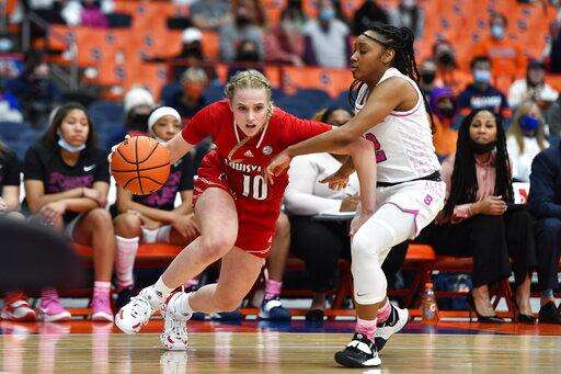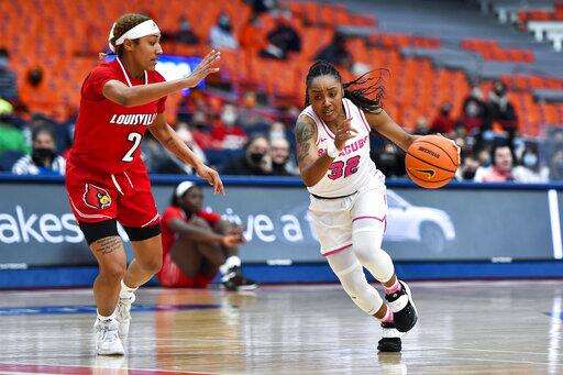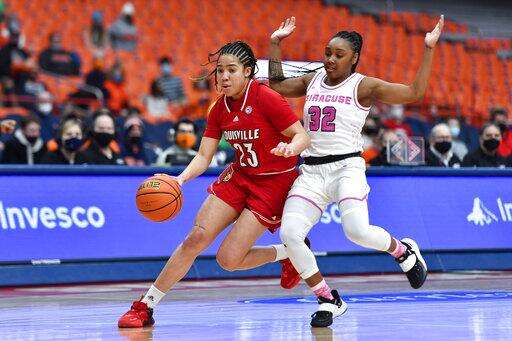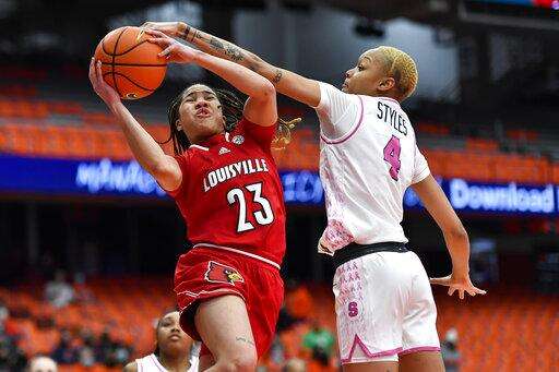 Louisville guard Chelsie Hall, left, is defended by Syracuse forward Alaysia Styles during the first half of an NCAA college basketball game in Syracuse, N.Y., Sunday, Feb. 6, 2022. (AP Photo/Adrian Kraus) The Associated Press