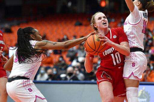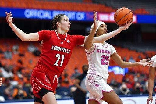Louisville forward Emily Engstler, left, reaches for a rebound against Syracuse guard Alaina Rice during the second half of an NCAA college basketball game in Syracuse, N.Y., Sunday, Feb. 6, 2022. Louisville won 100-64. (AP Photo/Adrian Kraus) The Associated Press