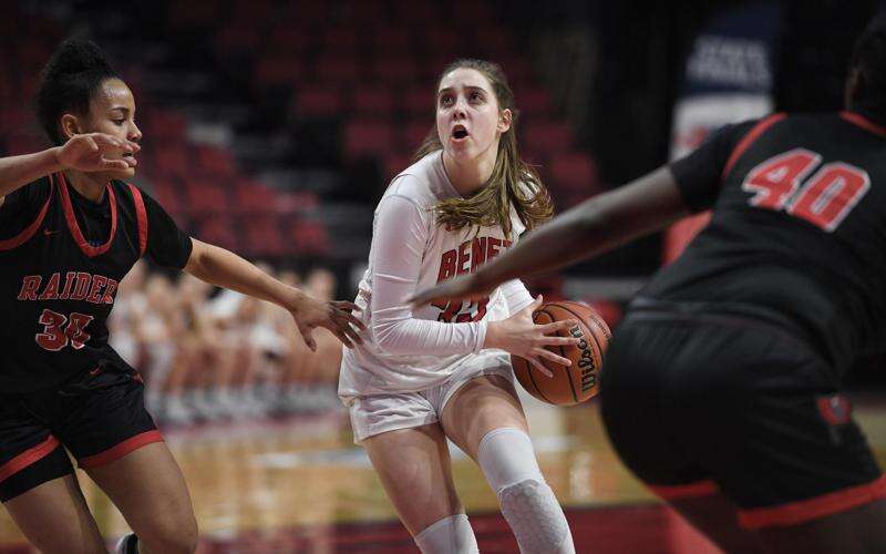 Benet Academy's Maggie Sularski looks for the hoop as Bolingbrook's Angelina Smith and Jasmine Jones, right, defend in the Class 4A state 3rd place game at Redbird Arena at Illinois State University in Normal on Friday, March 4, 2022.