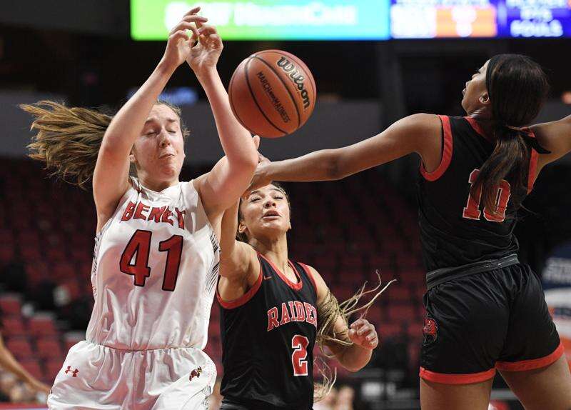 Benet Academy's Morgan Demos and Bolingbrook's Miranda Fry and Tatiana Thomas, middle, compete for the ball in the Class 4A state 3rd place game at Redbird Arena at Illinois State University in Normal on Friday, March 4, 2022.