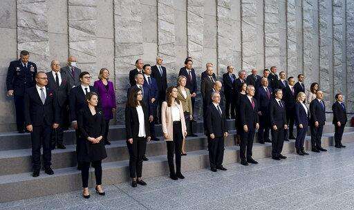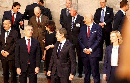 NATO ministers pose during a group photo at an extraordinary NATO foreign ministers meeting at NATO headquarters in Brussels, Friday, March 4, 2022. U.S. Secretary of State Antony Blinken meets Friday with his counterparts from NATO and the European Union, as Russia's war on Ukraine entered its ninth day marked by the seizure of the strategic port city of Kherson and the shelling of Europe's largest nuclear power plant. (Olivier Douliery, Pool Photo via AP)
