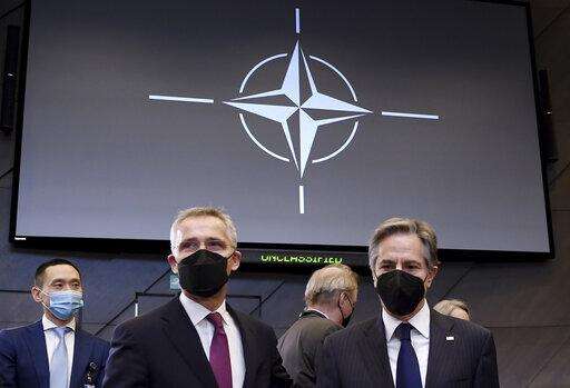 U.S. Secretary of State Antony Blinken, right, poses with NATO Secretary General Jens Stoltenberg during a an extraordinary NATO foreign ministers meeting at NATO headquarters in Brussels, Friday, March 4, 2022. U.S. Secretary of State Antony Blinken meets Friday with his counterparts from NATO and the European Union, as Russia's war on Ukraine entered its ninth day marked by the seizure of the strategic port city of Kherson and the shelling of Europe's largest nuclear power plant. (Olivier Douliery, Pool Photo via AP)