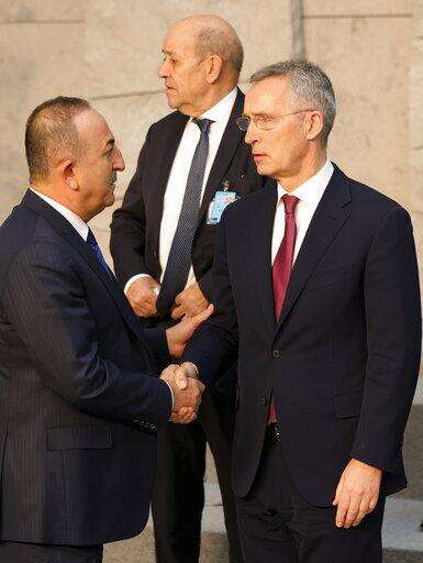 Turkish Foreign Minister Mevlut Cavusoglu, left, speaks with NATO Secretary General Jens Stoltenberg during a group photo at an extraordinary NATO foreign ministers meeting at NATO headquarters in Brussels, Friday, March 4, 2022. U.S. Secretary of State Antony Blinken meets Friday with his counterparts from NATO and the European Union, as Russia's war on Ukraine entered its ninth day marked by the seizure of the strategic port city of Kherson and the shelling of Europe's largest nuclear power plant. (AP Photo/Olivier Matthys)