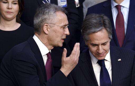 NATO Secretary General Jens Stoltenberg, left, speaks with U.S. Secretary of State Antony Blinken as they take part in a group photo at an extraordinary NATO foreign ministers meeting at NATO headquarters in Brussels, Friday, March 4, 2022. U.S. Secretary of State Antony Blinken meets Friday with his counterparts from NATO and the European Union, as Russia's war on Ukraine entered its ninth day marked by the seizure of the strategic port city of Kherson and the shelling of Europe's largest nuclear power plant. (Olivier Douliery, Pool Photo via AP)