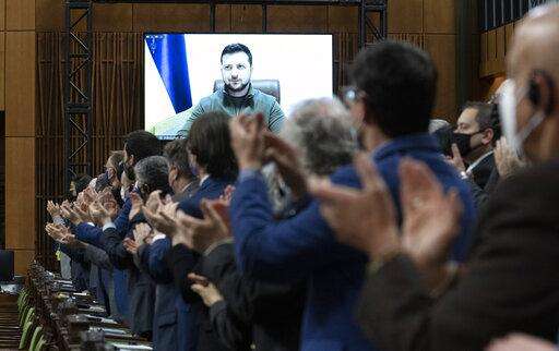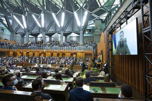 TORONTO (AP) - Ukrainian President Volodymyr Zelenskyy asked Canadians Tuesday to imagine bombs landing in their communities as he urged the Canadian Parliament and government to exert greater economic and military pressure on Russia.