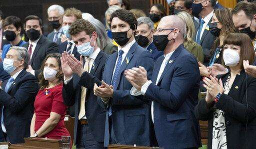 Canadian Prime Minister Justin Trudeau stands and applauds with members of parliament following an address by Ukrainian President Volodymyr Zelenskyy to parliament, Tuesday, March 15, 2022 in Ottawa. (Adrian Wyld/The Canadian Press via AP) The Associated Press