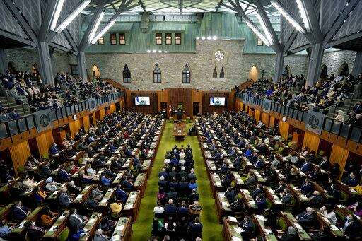 Canadian Parliamentarians and invited guests listen to Ukrainian President Volodymyr Zelenskyy address the Canadian parliament, Tuesday, March 15, 2022 in Ottawa. (Adrian Wyld /The Canadian Press via AP) The Associated Press