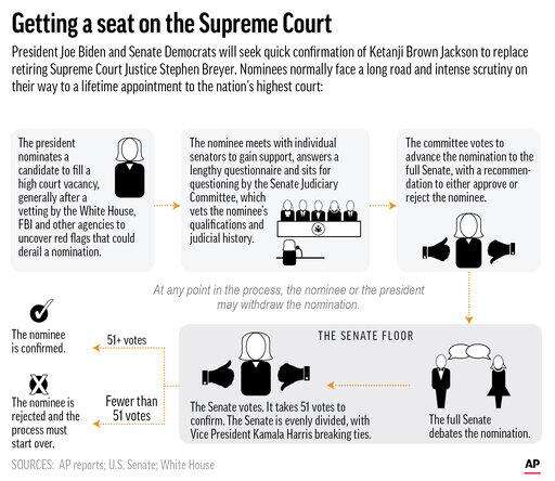 President Joe Biden chose Jackson in February, fulfilling a campaign pledge to nominate a Black woman to the Supreme Court. She would take the seat of Justice Stephen Breyer, who announced in January that he would retire this summer after 28 years.