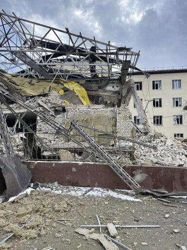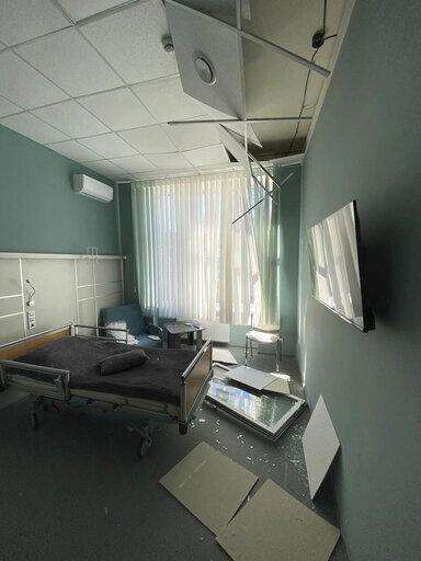 This photo provided by Volodymyr Matsokin shows damage to the hospital in Izyum, Ukraine, on March 8, 2022. (Volodymyr Matsokin via AP) The Associated Press