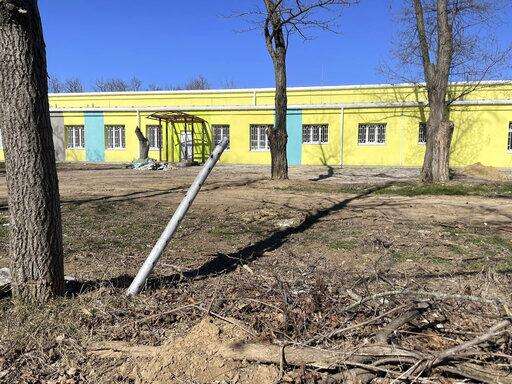 AP video from March 11 shows damage to ambulances and buildings at Dergachi Central Hospital, which Mayor Vyacheslav Zadorenko says resulted from Russian attack on his town. That video also shows expended cluster rocket canisters impaled in the ground. Weakley identified them as Russian-made 9M27K cargo rockets, which carry the same bomblets found at the children's hospital in Kharkiv.