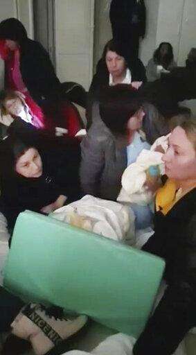 In this image from video provided by Dr. Vitalii Gyrin , staff and patients take shelter in a basement of the Adonis hospital in Kyiv, Ukraine, ahead of evacuation, as fighting broke out outside including airstrikes on Feb. 28, 2022. (Dr. Vitalii Gyrin via AP) The Associated Press