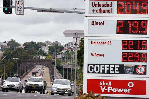 FILE - Motorists drive past a fuel price display in Sydney, Tuesday, March 29, 2022. Disruptions to supplies of commodities, financial strains and higher prices are among the shocks from the war in Ukraine that will slow economies in Asia in coming months, the World Bank says in a report released Tuesday, April 5, 2022. (AP Photo/Rick Rycroft, File) The Associated Press