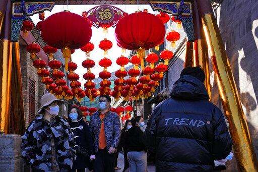 FILE- Shoppers visit a popular retail street in Beijing on Saturday, Feb. 26, 2022. Disruptions to supplies of commodities, financial strains and higher prices are among the shocks from the war in Ukraine that will slow economies in Asia in coming months, the World Bank says in a report released Tuesday, April 5, 2022. (AP Photo/Ng Han Guan) The Associated Press