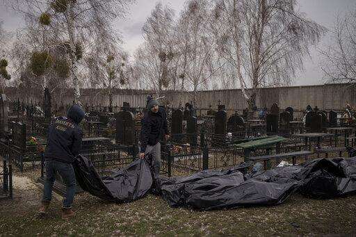 Workers carry the body of people found dead to a cemetery in Bucha, outskirts of Kyiv, Ukraine, Tuesday, April 5, 2022. Ukraine's president told the U.N. Security Council on Tuesday that the Russian military must be brought to justice immediately for war crimes, accusing invading troops of the worst atrocities since World War II. He stressed that Bucha was only one place and there are more with similar horrors. (AP Photo/Felipe Dana) The Associated Press