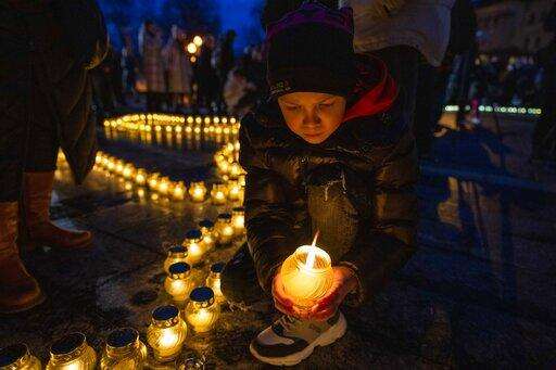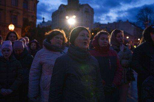People listen to prayers before lighting candles forming Ukraine's map, in memory of lost lives, in front of the Taras Shevchenko monument, in Lviv, western Ukraine, Tuesday, April 5, 2022. (AP Photo/Nariman El-Mofty) The Associated Press