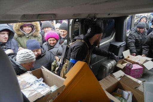 Local residents get volunteers' humanitarian aid in Bucha close to Kyiv, Ukraine, Tuesday, Apr. 5, 2022. Ukraine's president told the U.N. Security Council on Tuesday that the Russian military must be brought to justice immediately for war crimes, accusing invading troops of the worst atrocities since World War II. He stressed that Bucha was only one place and there are more with similar horrors. (AP Photo/Efrem Lukatsky) The Associated Press