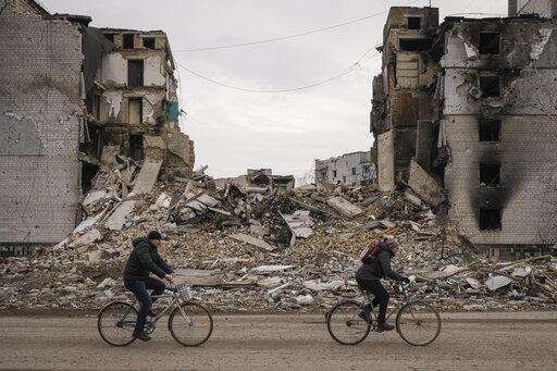 People ride bicycles by an apartment building destroyed during fighting between Ukrainian and Russian forces in Borodyanka, Ukraine, Tuesday, April 5, 2022. Ukrainian President Volodymyr Zelenskyy accused Russian troops of gruesome atrocities in Ukraine and told the U.N. Security Council on Tuesday that those responsible should immediately be brought up on war crimes charges in front of a tribunal like the one set up at Nuremberg after World War II.(AP Photo/Vadim Ghirda) The Associated Press