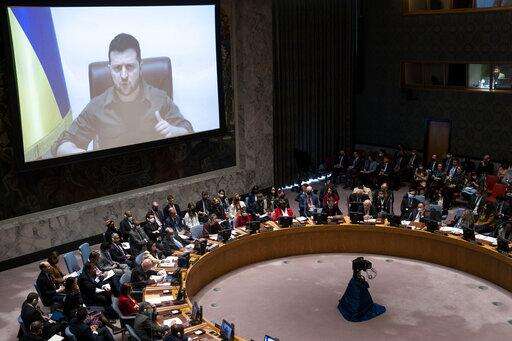 Speaking by video Tuesday to the U.N. Security Council, Zelenskyy said civilians in towns around Kyiv were tortured, shot in the back of the head, thrown down wells, blown up with grenades in their apartments and crushed to death by tanks while in cars.