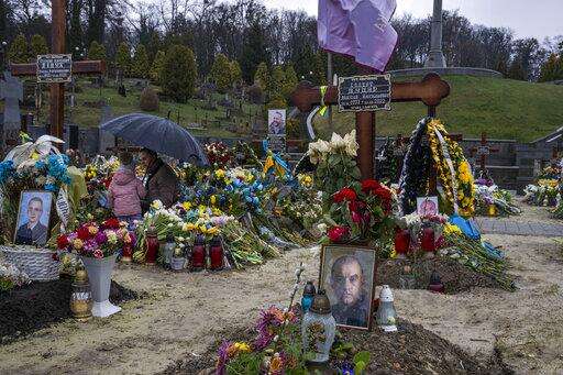Tetiana Rurak, 25-year-old widow Oleksandra Rurak, visits her soldier husband Volodymyr Rurak's, grave with her one and a half year old daughter, after he was killed in action, at the Lychakiv cemetery, in Lviv, western Ukraine, Tuesday, April 5, 2022. (AP Photo/Nariman El-Mofty) The Associated Press