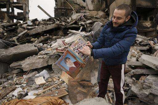 Elsewhere in Ukraine, in Borodyanka, northwest of Kyiv, a 25-year-old, Dmitriy Yevtushkov, searched the rubble of apartment buildings and found that only a photo album remained from his family's home.