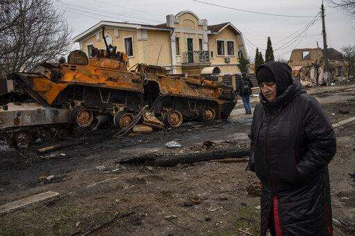 A woman walks next to a destroyed Russian armor vehicle in Bucha, in the outskirts of Kyiv, Ukraine, Tuesday, April 5, 2022. Ukraine's president plans to address the U.N.'s most powerful body after even more grisly evidence emerged of civilian massacres in areas that Russian forces recently left. (AP Photo/Rodrigo Abd) The Associated Press