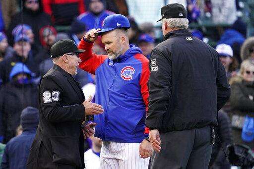 Chicago Cubs manager David Ross, center, argues with umpire Lance Barksdale, left, and umpire Ted Barrett during the eighth inning of a baseball game against the Milwaukee Brewers in Chicago, Saturday, April 9, 2022. (AP Photo/Nam Y. Huh) The Associated Press