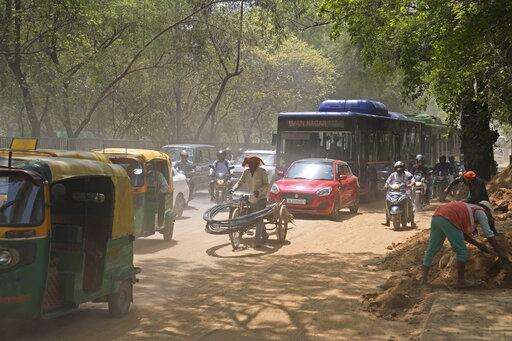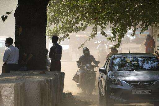Commuters drive amidst dust and a heat wave that lashes the capital, in New Delhi, India, Monday, April 11, 2022. On Tuesday, the India Meteorological Department predicted maximum temperatures in New Delhi to touch 105.8 degrees Fahrenheit (41 degrees Celsius), nearly eight notches above the season's normal. (AP Photo/Manish Swarup) The Associated Press