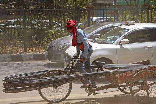 A worker pedals his cart carrying iron rods for construction amidst a heat wave lashes the capital, in New Delhi, India, Monday, April 11, 2022. On Tuesday, the India Meteorological Department predicted maximum temperatures in New Delhi to touch 105.8 degrees Fahrenheit (41 degrees Celsius), nearly eight notches above the season's normal. (AP Photo/Manish Swarup) The Associated Press
