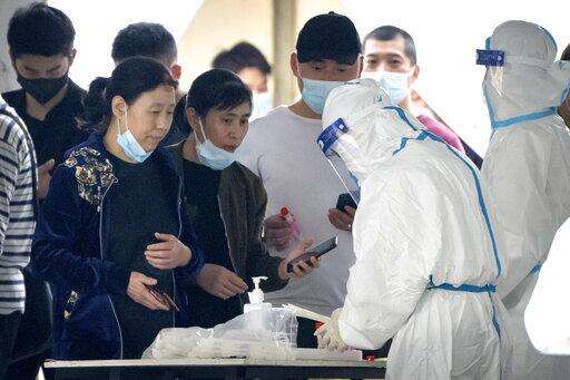 People register for COVID-19 tests at a coronavirus testing facility in Beijing, Saturday, April 23, 2022. Beijing is on alert after 10 middle school students tested positive for COVID-19 on Friday, in what city officials said was an initial round of testing. (AP Photo/Mark Schiefelbein)