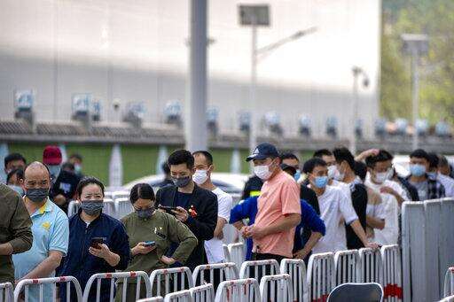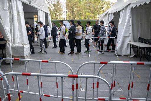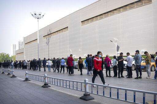 People stand in line for COVID-19 tests at a coronavirus testing facility in Beijing, Saturday, April 23, 2022. Beijing is on alert after 10 middle school students tested positive for COVID-19 on Friday, in what city officials said was an initial round of testing. (AP Photo/Mark Schiefelbein)