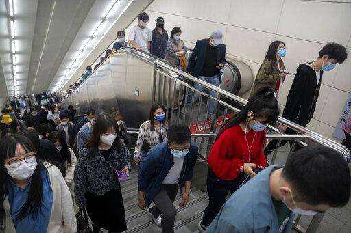 FILE - Commuters wearing face masks walk in a subway station in Beijing, Friday, April 22, 2022. Beijing is on alert after 10 middle school students tested positive for COVID-19 on Friday, in what city officials said was an initial round of testing. (AP Photo/Mark Schiefelbein, File)