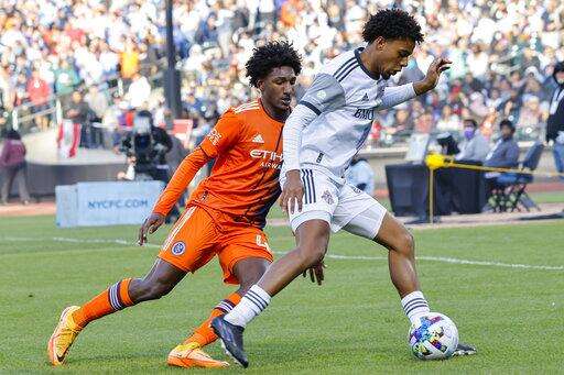 Toronto FC midfielder Kosi Thompson, right, fights for the ball against New York City FC forward Talles Magno, left, in the second half of an MLS soccer match, Sunday, April 24, 2022, in New York. (AP Photo/Eduardo Munoz Alvarez) The Associated Press