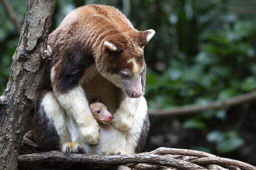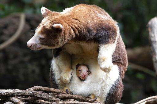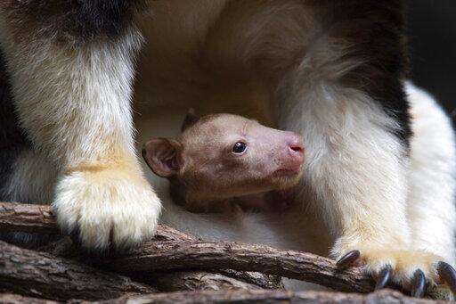 NEW YORK (AP) - A baby tree kangaroo that's just poking its nose out of its mother's pouch is the first of its species born at the Bronx Zoo since 2008, zoo officials announced Friday.