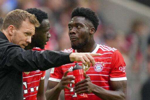 Bayern's head coach Julian Nagelsmann, left, gives instructions to Tanguy Nianzou, center, and Alphonso Davies during the German Bundesliga soccer match between Bayern Munich and Stuttgart, at the Allianz Arena, in Munich, Germany, Sunday, May 8, 2022. (AP Photo/Michael Probst )