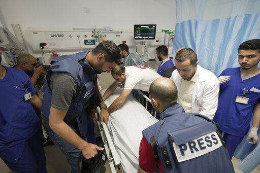 Journalists and medics surround the body of Shireen Abu Akleh, a journalist for Al Jazeera network, into the morgue inside the Hospital in the West Bank town of Jenin, Wednesday, May 11, 2022. The well-known Palestinian reporter for the broadcaster's Arabic language channel was shot and killed while covering an Israeli raid in the occupied West Bank town of Jenin early Wednesday, the Palestinian health ministry said. (AP Photo/Majdi Mohammed)