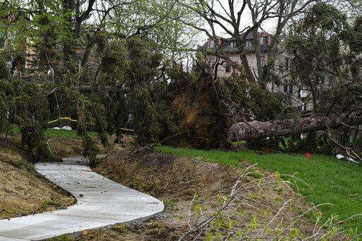 A walking path is blocked by fallen trees, pulled up at the roots, on Augustana University's campus on Thursday, May 12, 2022, in Sioux Falls, S.D. Strong winds and possible tornadoes caused widespread damage in parts of the Midwest. (Erin Woodiel /The Argus Leader via AP)
