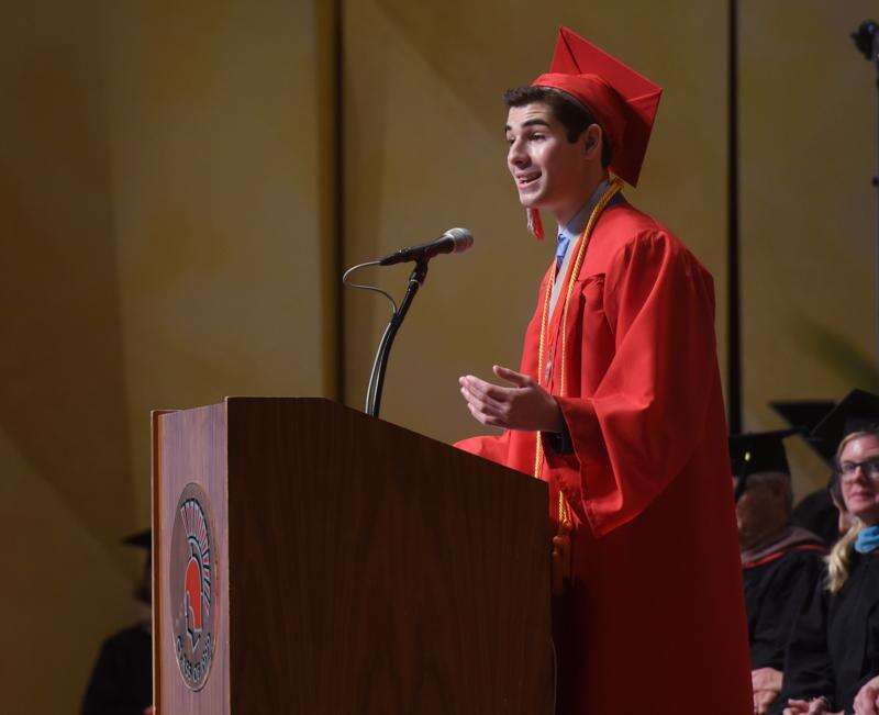 Jonah Simon delivers the student address during the Deerfield High School graduation at Ravinia May 25.