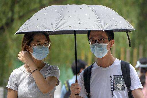 People wearing face masks walk under an umbrella at a public park on the first day of the Dragon Boat Festival holiday in Beijing, Friday, June 3, 2022, as China's capital has begun to reopen parks, shopping malls, and other places as a COVID-19 outbreak subsides. (AP Photo/Mark Schiefelbein)