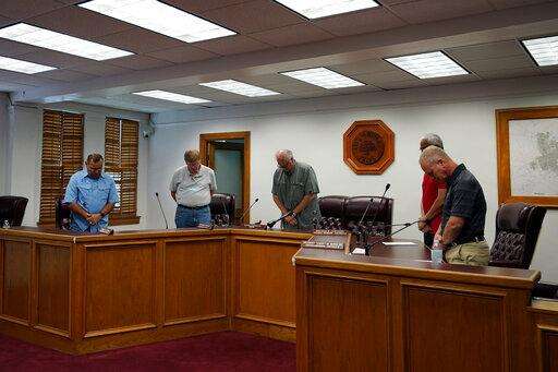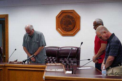 Uvalde Mayor Don McLaughlin, Jr., center, and members of the city council pray during a special emergency city council meeting, Tuesday, June 7, 2022, in Uvalde, Texas, to reissue the mayor's declaration of a local state of disaster due to the recent school shooting at Robb Elementary School. Two teachers and 19 students were killed. (AP Photo/Eric Gay)