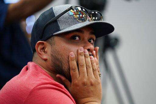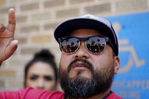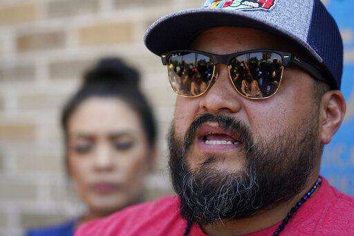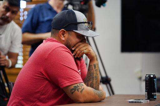 Alfred Garza III, father of school shooting victim Amerie Jo Garza, talks with the media following a special emergency city council meeting to reissue the mayor's declaration of local state of disaster due to the recent school shooting at Robb Elementary School, Tuesday, June 7, 2022, in Uvalde, Texas. Two teachers and 19 students were killed. (AP Photo/Eric Gay)