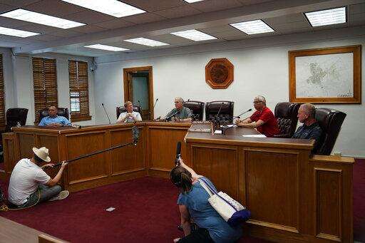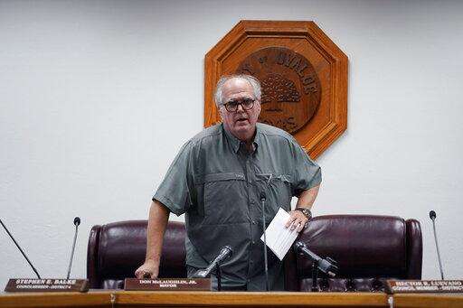 Uvalde Mayor Don McLaughlin, Jr., center, speaks during a special emergency city council meeting to reissue the mayor's declaration of local state of disaster due to the recent school shooting at Robb Elementary School, Tuesday, June 7, 2022, in Uvalde, Texas. Two teachers and 19 students were killed. (AP Photo/Eric Gay)