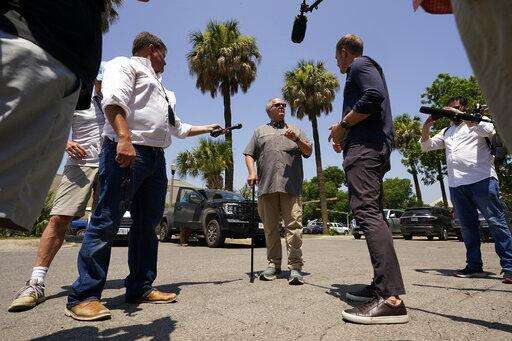 Uvalde Mayor Don McLaughlin, Jr., center, speaks to media following a special emergency city council meeting to reissue the mayor's declaration of local state of disaster due to the recent school shooting at Robb Elementary School, Tuesday, June 7, 2022, in Uvalde, Texas. (AP Photo/Eric Gay)