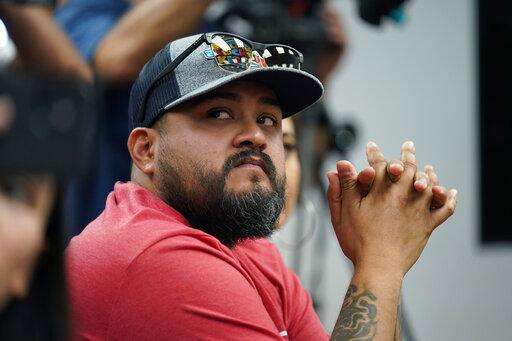 Alfred Garza III, father of school shooting victim Amerie Jo Garza, attends a special emergency city council meeting, Tuesday, June 7, 2022, in Uvalde, Texas, to reissue the mayor's declaration of a local state of disaster due to the recent school shooting at Robb Elementary School. Two teachers and 19 students were killed. (AP Photo/Eric Gay)