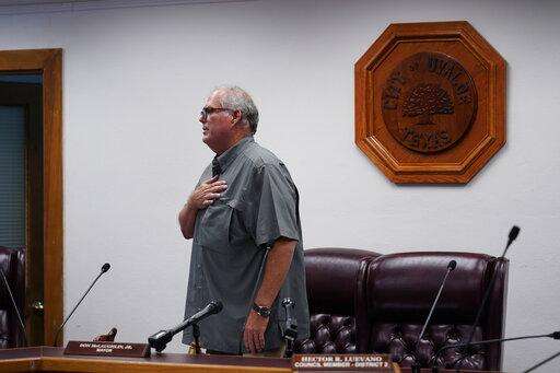 Uvalde Mayor Don McLaughlin, Jr., recites the "Pledge of Allegiance" during a special emergency city council meeting, Tuesday, June 7, 2022, in Uvalde, Texas, to reissue the mayor's declaration of a local state of disaster due to the recent school shooting at Robb Elementary School. Two teachers and 19 students were killed. (AP Photo/Eric Gay)