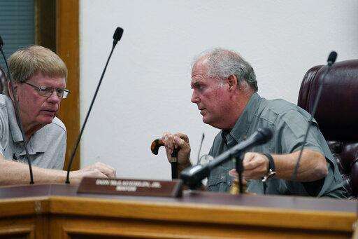 Uvalde Mayor Don McLaughlin, Jr., right, talks with council member Stephen Balke, left, during a special emergency city council meeting to reissue the mayor's declaration of local state of disaster due to the recent school shooting at Robb Elementary School, Tuesday, June 7, 2022, in Uvalde, Texas. Two teachers and 19 students were killed. (AP Photo/Eric Gay)