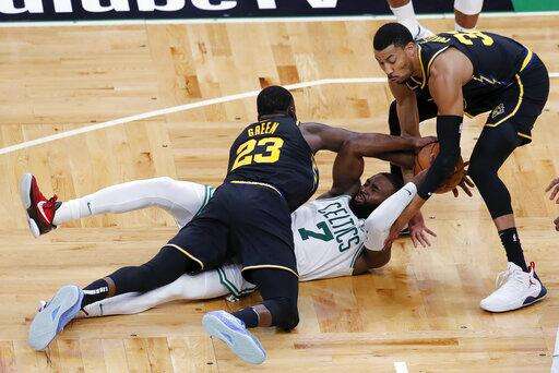 Golden State trailed by as many as 18 points in the first half, but it was a 12-point Boston lead with about four minutes left when Jayson Tatum missed a jumper from the foul line. The rebound was batted around and three Celtics and as many Warriors went to the floor trying to secure the basketball.