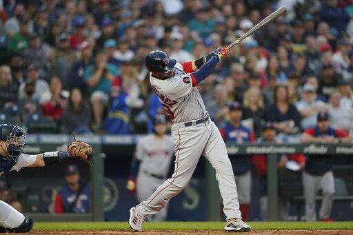 Boston Red Sox's J.D. Martinez follows through on a two-run home run during the fifth inning of the team's baseball game against the Seattle Mariners, Saturday, June 11, 2022, in Seattle. (AP Photo/Ted S. Warren) The Associated Press